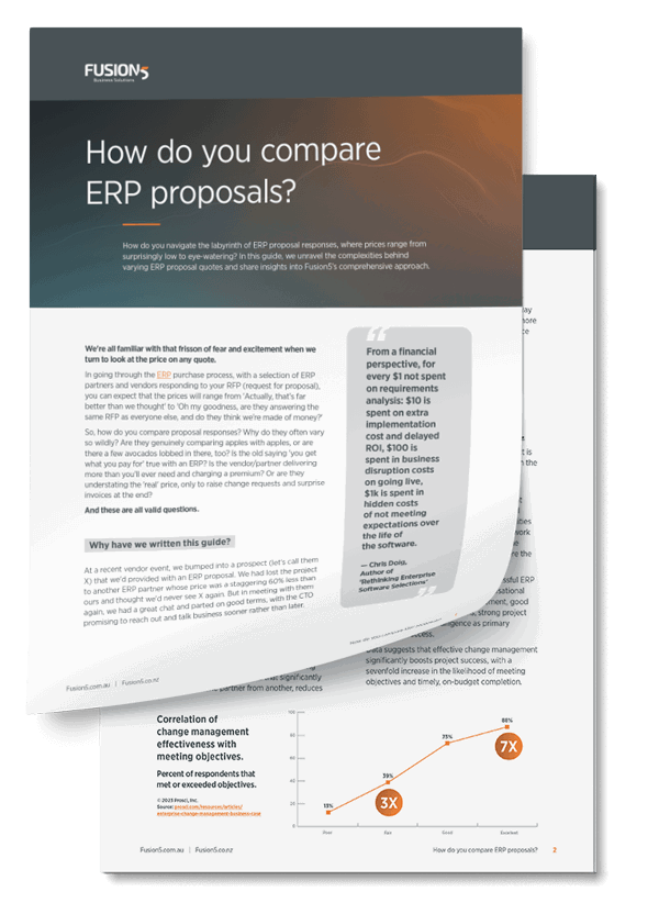 Navigating different ERP proposals can be a complex task, with quotes ranging from surprisingly low to eye-watering. In this free ERP proposal comparison guide, we unravel the intricacies behind varying quotes, explain why a cheaper quote may end up costing you dearly, and provide insights into Fusion5’s comprehensive approach.