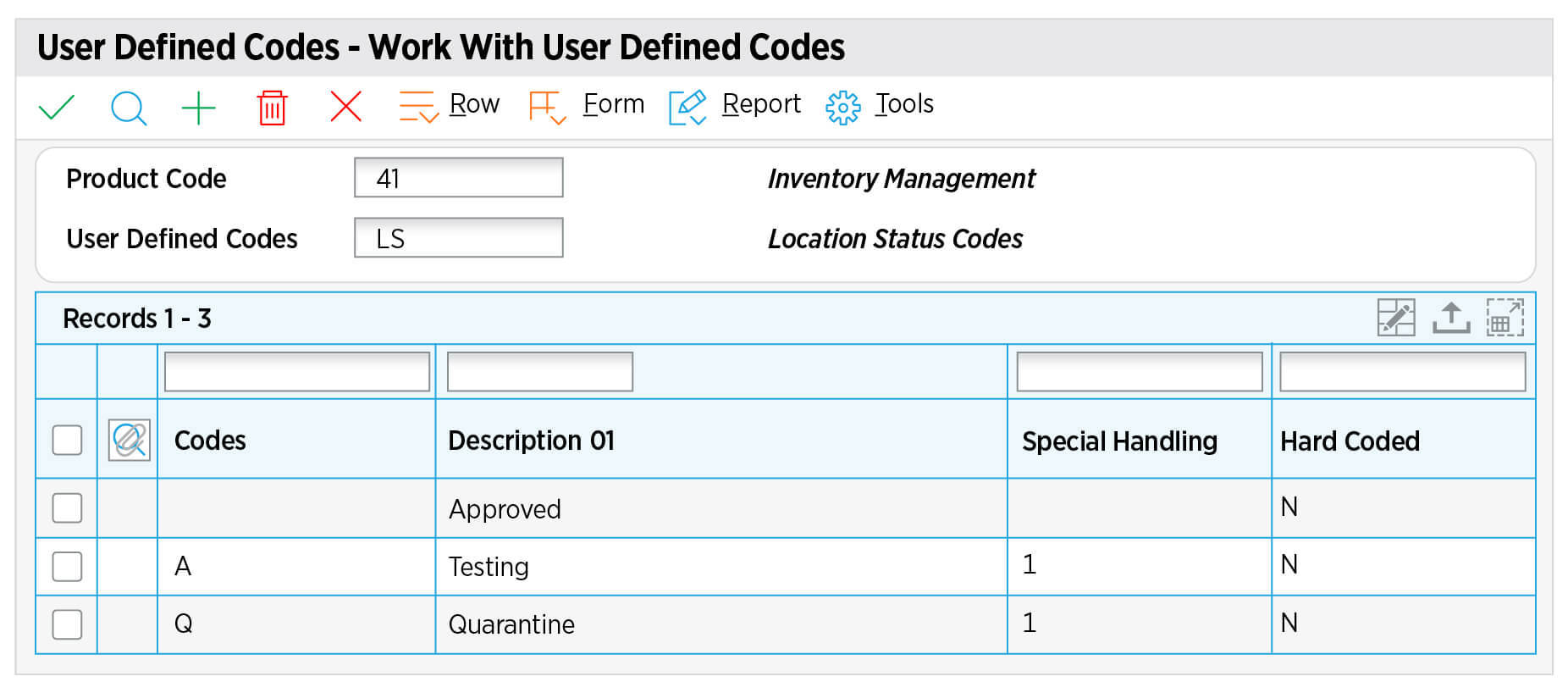 The hold status of a location is controlled by a new User Defined Code (UDC) 41/LS - Location Status Codes. These codes determine the types of transactions allowed in a location:
